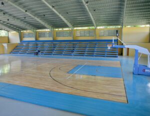 La remodelación del Polideportivo de Las Caobas incluyó la reconstrucción del techado, rehabilitación de la cancha, reparación de baños, gradas, iluminación, pintura general, tableros reglamentarios y adecuaciones estructurales.